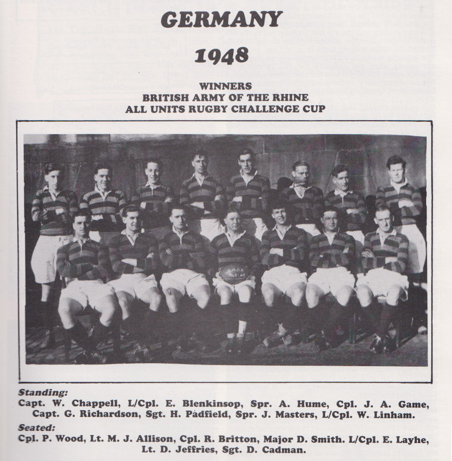 Max married Peggy Casey a QARANC nurse in 1953. They had two sons, Michael a TA officer for several years, who now lives in the US and Patrick who currently serves as a Squadron Commander in 2nd Royal Tank Regiment in Germany. Most Airborne Sappers will be aware Max represented BAOR and the Corps at Rugby; his photograph features prominently in the Tom Purves book "The 9th."